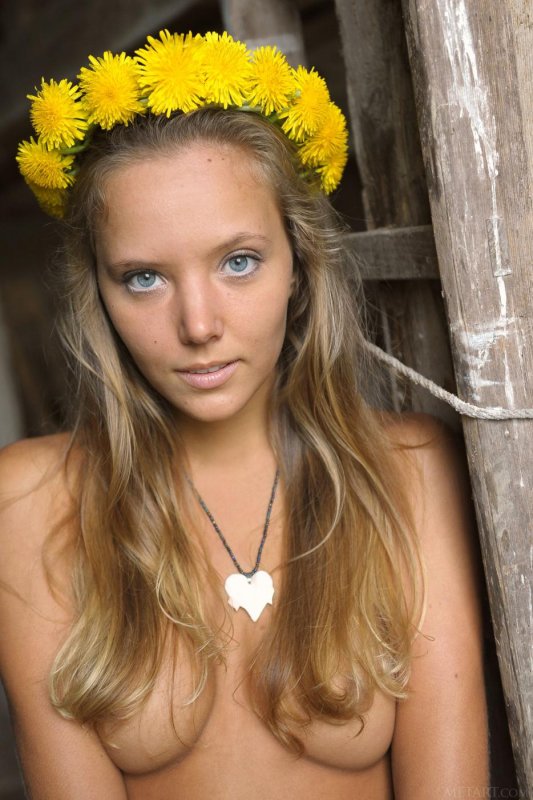 Молодая симпатичная девушка позирует голая в деревне у бабушки. Блондинка забирается на старую дряхлую телегу, на фоне которой ее молодое тело кажется еще более соблазнительным.
